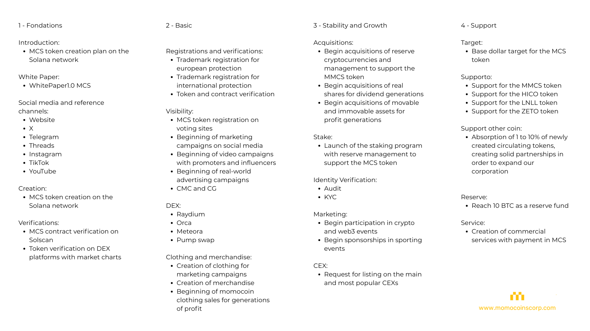 At the heart of our project is an innovative approach: we reinvest a significant portion of the funds raised in real assets, such as real estate, tech startups, and partnerships with established companies, to create a solid and diversified foundation. At the same time, we invest in the blockchain network, expanding infrastructure such as decentralized nodes, scalability protocols, and integrations with other chains, to strengthen Momocoin's resilience and utility.